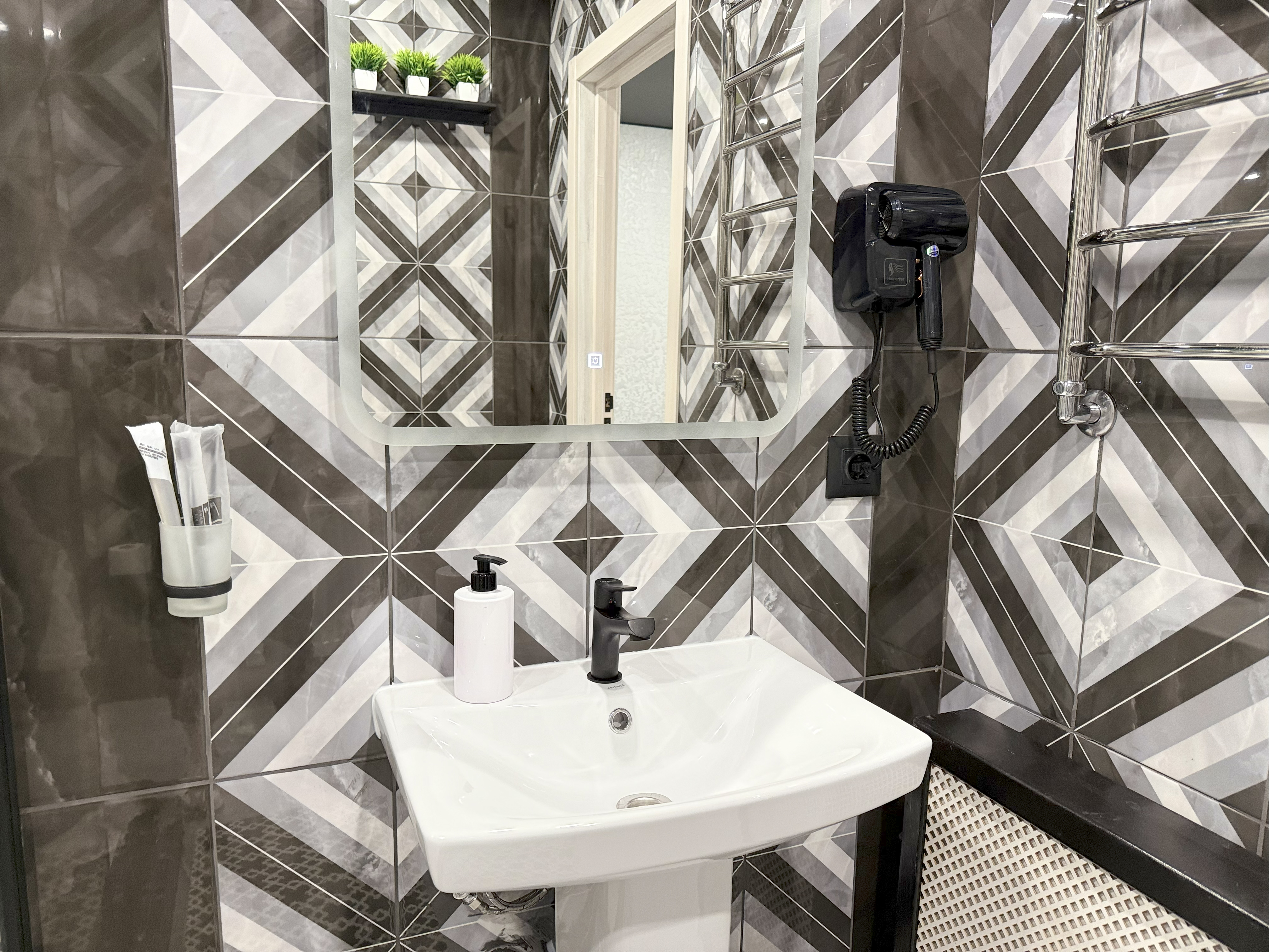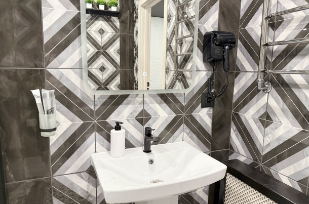 - Комфорт в деталях Просторная ванная комната с душевой кабиной, феном и комплектом туалетных принадлежностей.